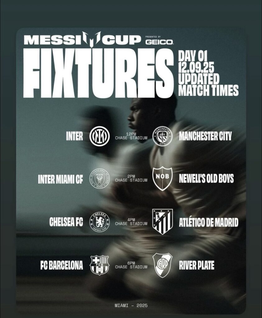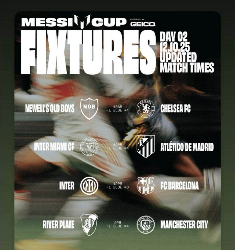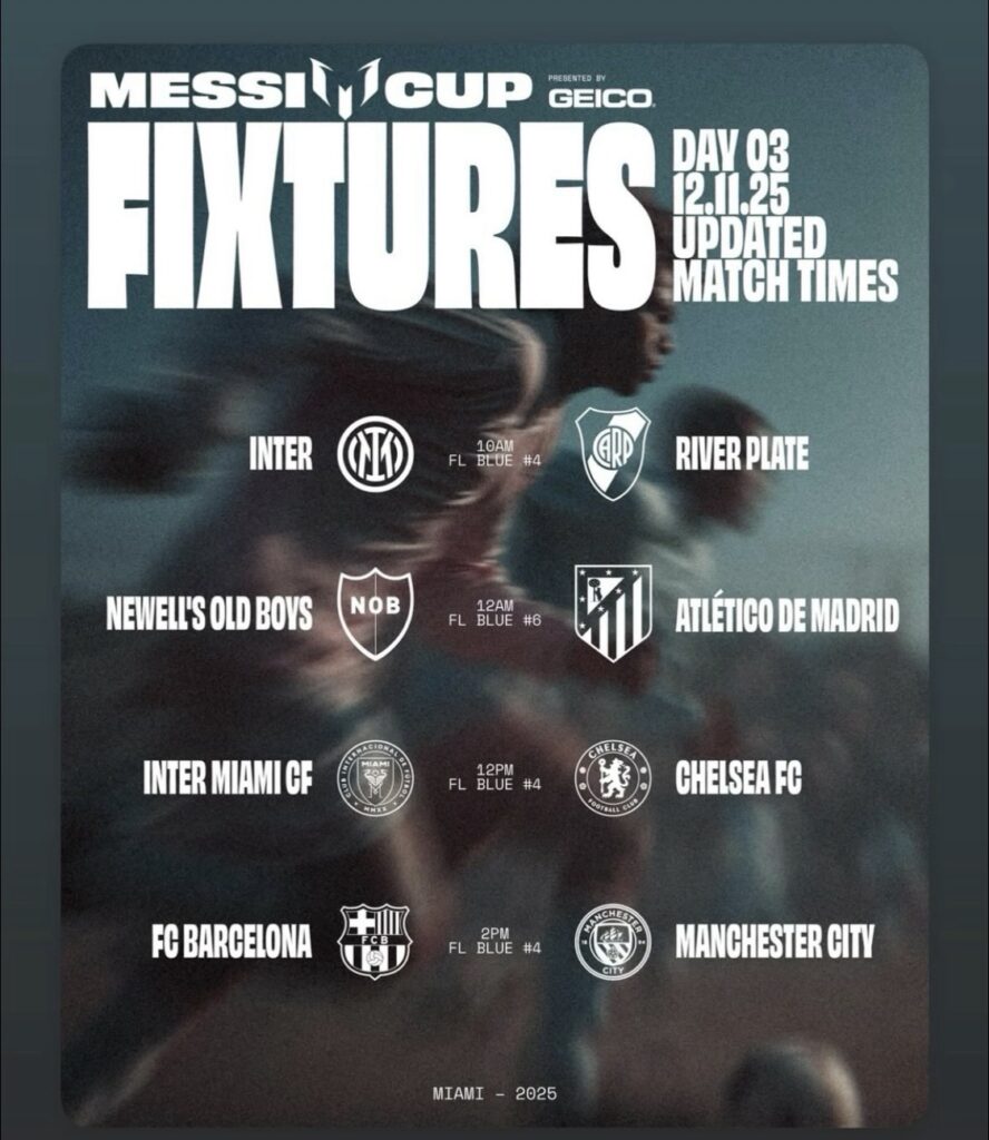 El último día se disputarán el partido por el tercer lugar y la final del campeonato, ambos en Chase Stadium, donde se coronará al primer campeón de la Messi Cup.