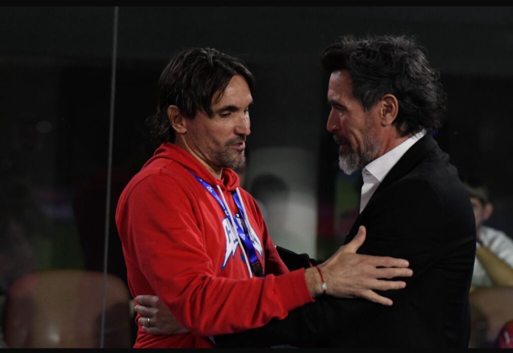Foto: Martin Leiva – Saludo entre Diego Martinez y Eduardo Dominguez. DT de Cerro y Estudiantes