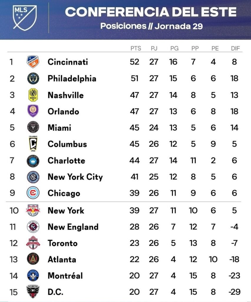 La Conferencia Este de la Major League Soccer (MLS) se encuentra en un punto emocionante de la temporada al acercarse la fecha 30 a jugarse entre el 23 y 24 de agosto. Los equipos están intensificando su competencia, luchando por mantenerse en los codiciados primeros puestos de la tabla. A continuación, un resumen de los cinco primeros lugares y con quiénes se enfrentarán en la próxima jornada.