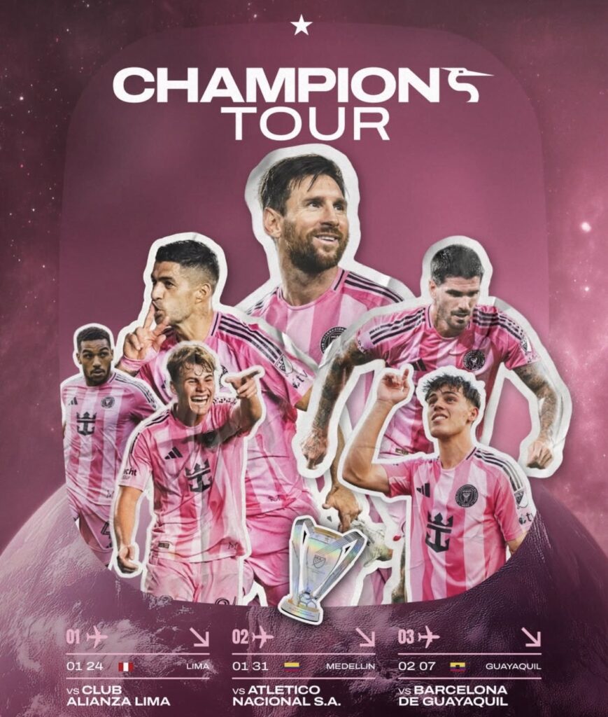 El campeón de la Major League Soccer (MLS) 2025, Inter Miami, liderado por Lionel Messi, realizará una gira por Sudamérica en enero y febrero de 2026, denominada «Champions Tour». El equipo jugará tres partidos amistosos en Perú, Colombia y Ecuador.