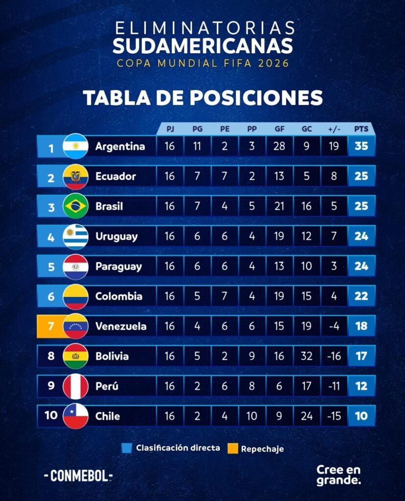 Las selecciones de Colombia (22 puntos), Venezuela y Bolivia están en una intensa batalla por el 6° lugar, que garantiza un lugar directo al Mundial. El panorama es sencillo: uno de estos equipos avanzará, otro tendrá la oportunidad de un repechaje, y el tercero se quedará fuera.